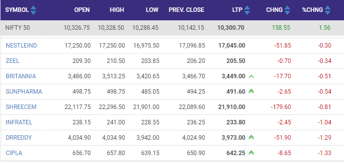 सोमवार को कारोबार के पहले दिन बीएसई 553.93 अंक ऊपर और निफ्टी 184.6 पॉइंट की बढ़त के साथ खुला। इससे पहले बीते सप्ताह शुक्रवार को बीएसई और निफ्टी बढ़त के साथ बंद हुए थे। उस दिन दिनभर की ट्रेडिंग के दौरान बीएसई 424.73 अंक तक और निफ्टी 130.8 पॉइंट तक ऊपर जाने में कामयाब रहा था। कारोबार के अंत में बीएसई 306.54 अंक या 0.90% ऊपर 34,287.24 पर और निफ्टी 113.05 पॉइंट या 1.13% ऊपर 10,142.15 पर बंद हुआ था।