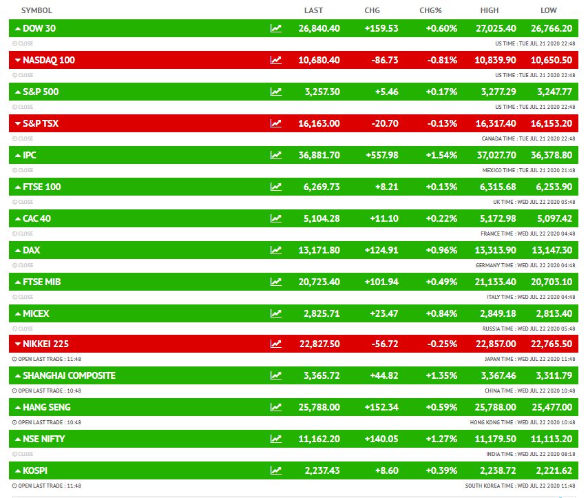 मंगलवार को अमेरिकी बाजार उतार-चढ़ाव के साथ बंद हुए। अमेरिकी बाजार डाउ जोंस 0.60 फीसदी की बढ़त के साथ 159.53 अंक ऊपर 26,840.40 पर बंद हुआ था। वहीं, अमेरिका के दूसरे बाजार नैस्डैक 0.81 फीसदी गिरावट के साथ 86.73 अंक नीचे 10,680.40 पर बंद हुआ था। दूसरी तरफ, एसएंडपी 0.17 फीसदी बढ़त के साथ 5.46 पॉइंट ऊपर 3,257.30 पर बंद हुआ था। चीन का शंघाई कंपोजिट 1.54 फीसदी बढ़त के साथ 51.19 अंक ऊपर 3,372.08 पर बंद हुआ था। इधर इटली, जर्मनी और फ्रांस के बाजार में भी बढ़त रही।