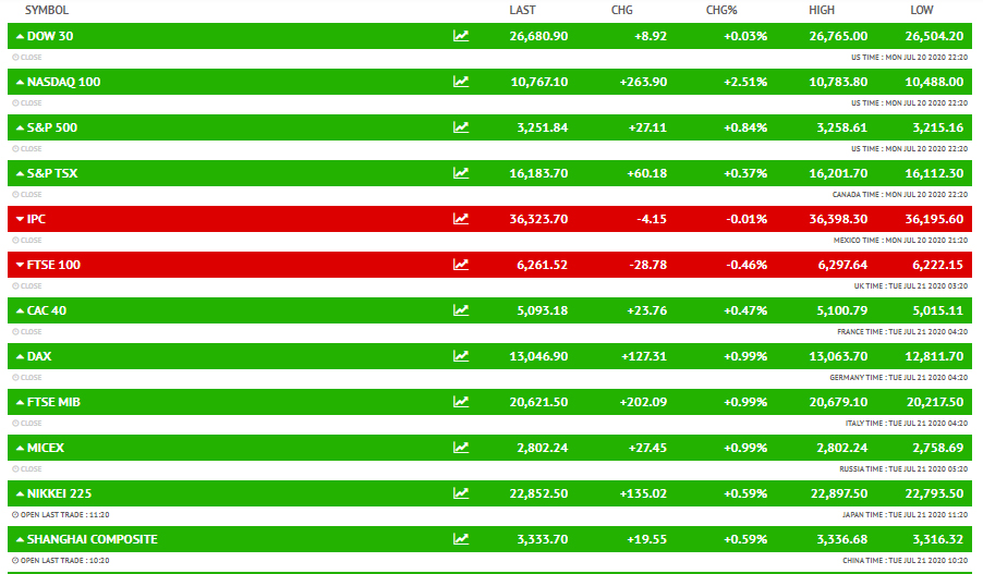 सोमवार को अमेरिकी बाजार बढ़त के साथ बंद हुए। अमेरिकी बाजार डाउ जोंस 0.03 फीसदी की बढ़त के साथ 8.92 अंक ऊपर 26,680.90 पर बंद हुआ था। वहीं, अमेरिका के दूसरे बाजार नैस्डैक 2.51 फीसदी बढ़त के साथ 263.90 अंक ऊपर 10,767.10 पर बंद हुआ था। दूसरी तरफ, एसएंडपी 0.84 फीसदी बढ़त के साथ 27.11 पॉइंट ऊपर 3,251.84 पर बंद हुआ था। चीन का शंघाई कम्पोसिट 0.55 फीसदी बढ़त के साथ 18.21 अंक ऊपर 3,332.36 पर बंद हुआ था। इधर इटली, जर्मनी और फ्रांस के बाजार में भी बढ़त रही।