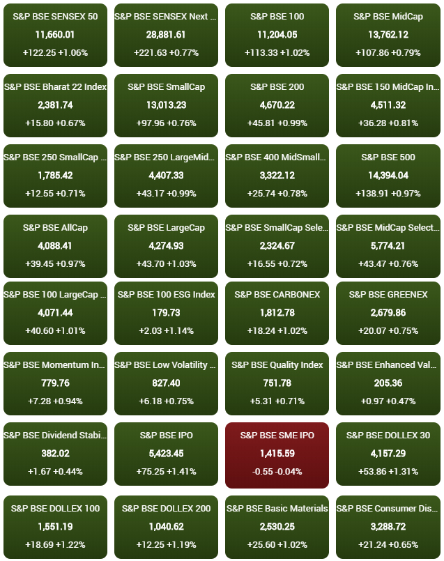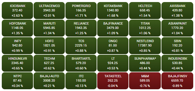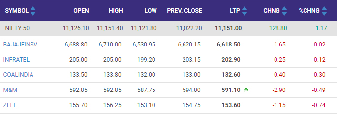 मंगलवार को कारोबार के पहले दिन बीएसई 404.62अंक ऊपर और निफ्टी 103.9पॉइंट की बढ़त के साथ खुला। इससे पहले सोमवार को बीएसई 388.89 अंक ऊपर और निफ्टी 97.75 पॉइंट की बढ़त के साथ खुला था। दिनभर की ट्रेडिंग के दौरान बीएसई 413.29 अंक तक और निफ्टी 116 पॉइंट तक ऊपर जाने में कामयाब रहा। कारोबार के अंत में बीएसई 398.85 अंक ऊपर 37,418.99 पर और निफ्टी 120.50 पॉइंट ऊपर 11,022.20 पर बंद हुआ था।