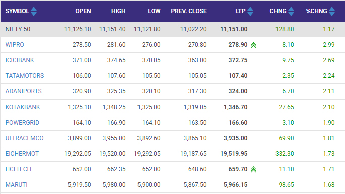 09:32 AM निफ्टी 50 के टॉप-10 गेनर स्टॉक्स; अभी विप्रो के शेयर में सबसे ज्यादा 2.99% की बढ़त है।
