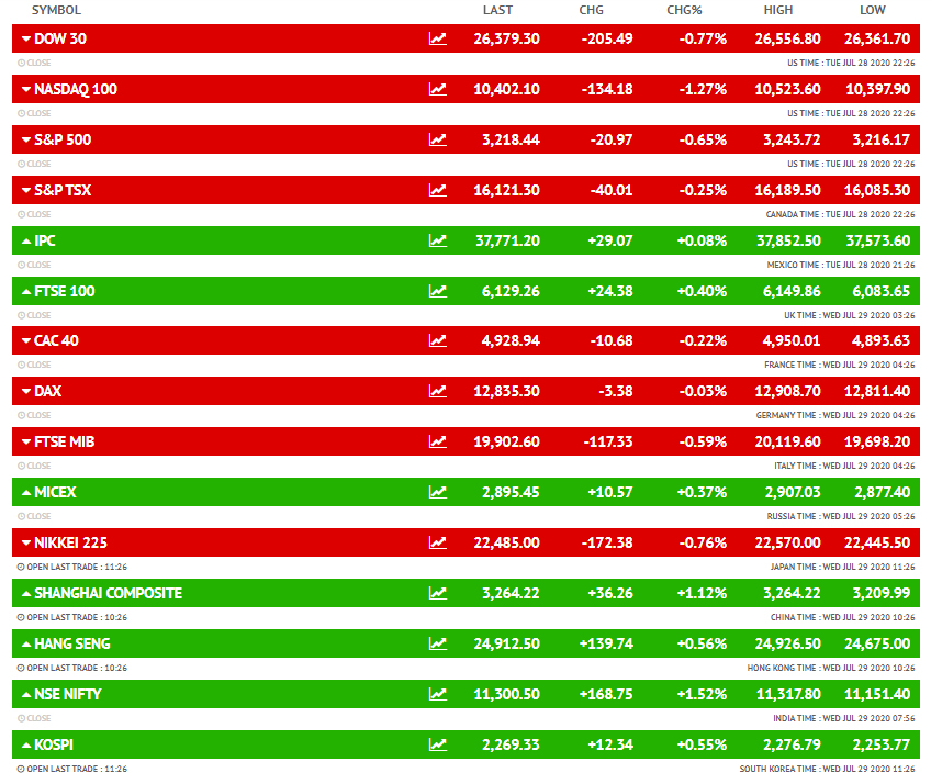 मंगलवार को अमेरिकी बाजार गिरावट के साथ बंद हुए। अमेरिकी बाजार डाउ जोंस 0.77 फीसदी की गिरावट के साथ 205.49 अंक नीचे 26,379.30 पर बंद हुआ था। वहीं, अमेरिका के दूसरे बाजार नैस्डैक 1.27 फीसदी गिरावट के साथ 134.18 अंक नीचे 10,402.10 पर बंद हुआ था। दूसरी तरफ, एसएंडपी 0.65 फीसदी गिरावट के साथ 20.97 पॉइंट नीचे 3,218.44 पर बंद हुआ था। हालांकि, चीन का शंघाई कंपोजिट 1.13 फीसदी बढ़त के साथ 36.51 अंक ऊपर 3,264.47 पर बंद हुआ था। इधर इटली, जर्मनी और फ्रांस के बाजार में भी गिरावट रही।