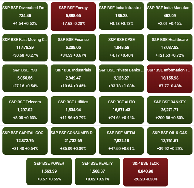 09:25 AM बीएसई के 23 सेक्टर में से 20 में बढ़त और 3 में गिरावट है; प्राइवेट बैंक सेक्टर में सबसे ज्यादा 1.03% की बढ़त है।