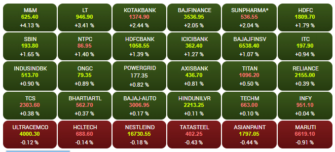 सोमवार को कारोबार के पहले दिन बीएसई 127.85 अंक ऊपर और निफ्टी 56.2 पॉइंट की बढ़त के साथ खुला। इससे पहले शुक्रवार को बीएसई को बीएसई और निफ्टी बढ़त के साथ बंद होने में कामयाब रहे थे। कारोबार के अंत में बीएसई 15.12 अंक ऊपर 38,040.57 पर और निफ्टी 13.90 पॉइंट ऊपर 11,214.05 पर बंद हुआ था। शुक्रवार को जीएमएम पीफॉडलर लिमिटेड के शेयर में 18 फीसदी उछाल के साथ बंद हुए थे।
