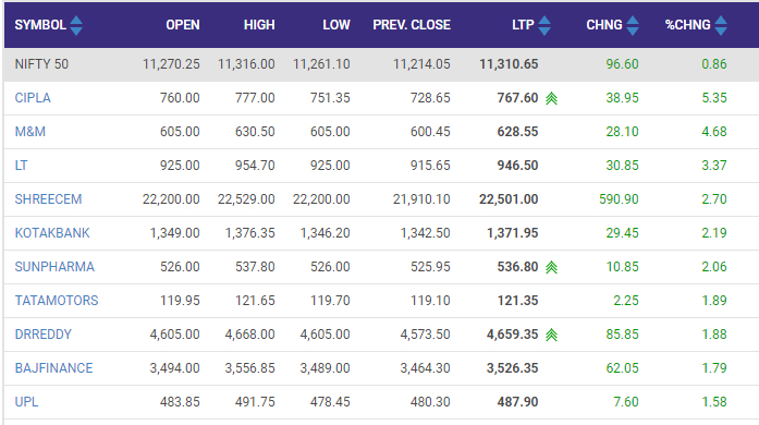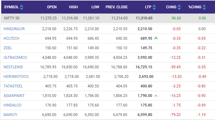 09:15 AM बीएसई 228.55 अंक ऊपर 38,269.12 पर और निफ्टी 67.50 पॉइंट ऊपर 11,281.55 पर कारोबार कर रहा है।