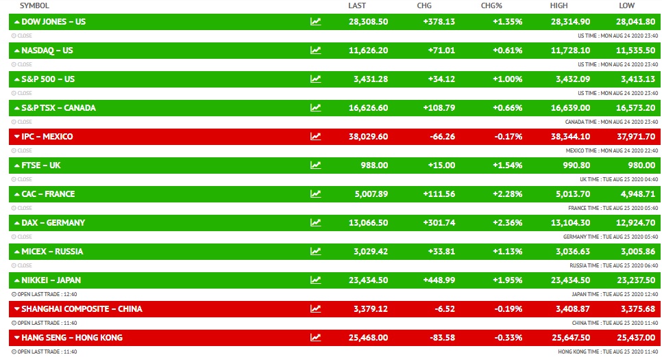 सोमवार को दुनियाभर के बाजारों में बढ़त देखने को मिली। अमेरिकी बाजार डाउ जोंस 1.35 फीसदी की बढ़त के साथ 378.13 अंक ऊपर 28,308.50 पर बंद हुआ था। वहीं, अमेरिका के दूसरे बाजार नैस्डैक 0.61 फीसदी बढ़त के साथ 71.01अंक ऊपर 11,626.20 पर बंद हुआ था। दूसरी तरफ, एसएंडपी 1.00 फीसदी बढ़त के साथ 34.12 पॉइंट ऊपर 3,431.28 पर बंद हुआ था।