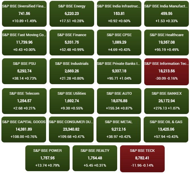 09:26 AM बीएसई के सभी 32 इंडेक्स में बढ़त है।