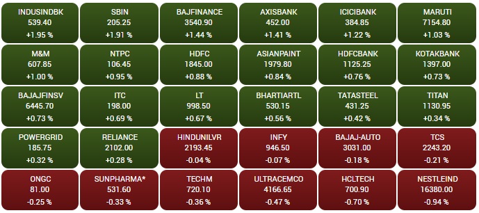मंगलवार को कारोबार के दूसरे दिन बीएसई 149 अंक ऊपर और निफ्टी 46 पॉइंट की बढ़त के साथ खुला। इससे पहले सोमवार को बीएसई 132 अंक ऊपर और निफ्टी 40 पॉइंट की बढ़त के साथ खुला था। दिनभर की ट्रेडिंग के दौरान बीएसई 460.22 अंक तक और निफ्टी 125.65 पॉइंट तक ऊपर जाने में कामयाब रहा था। कारोबार के अंत में बीएसई 364.36 अंक ऊपर 38,799.08 पर और निफ्टी 94.85 पॉइंट ऊपर 11,466.45 पर बंद हुआ था।