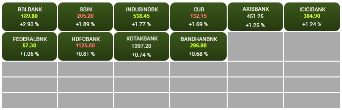 09:35 AM बीएसई बैंकिंग सेक्टर में शामिल सभी 10 बैंकों में बढ़त है। आरबीएल बैंक के शेयर में 3 फीसदी तक की बढ़त है।