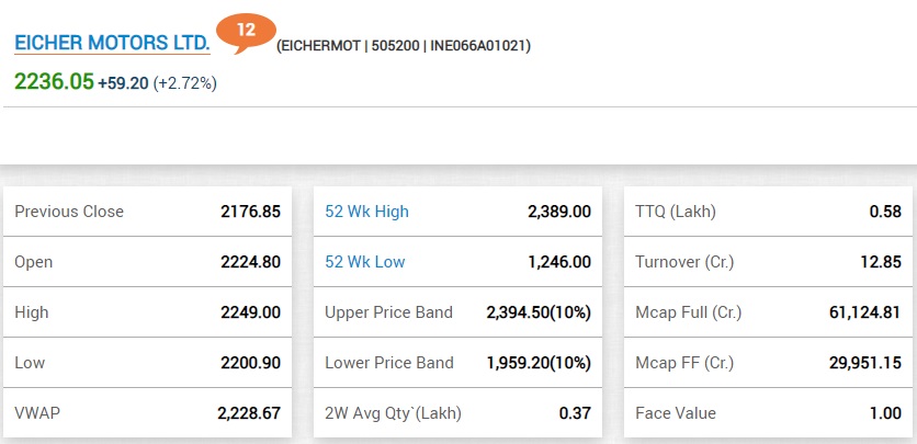 09:38 AM आयशर मोटर के शेयर में 3 फीसदी तक की बढ़त है। कल भी शेयर जोरदार तेजी के साथ बंद हुआ था।