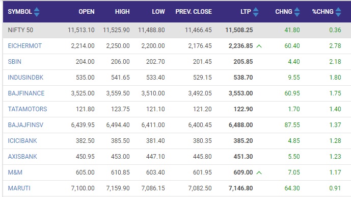 09:15 AM बीएसई 149.38 अंक ऊपर 38,948.46 पर और निफ्टी 46.65 अंक ऊपर 11,513.10 पर खुला।