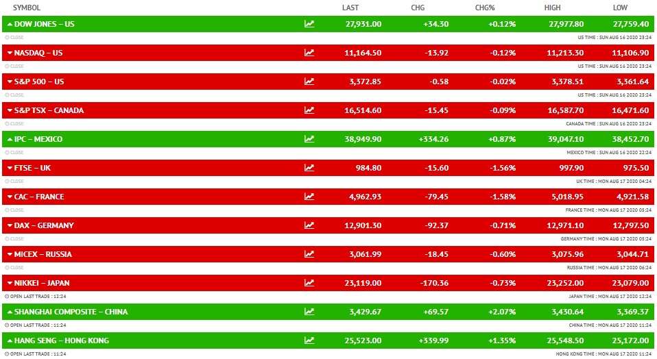 शुक्रवार को दुनियाभर के बाजारों में गिरावट और बढ़त दोनों देखने को मिली। अमेरिकी बाजार डाउ जोंस 0.12 फीसदी की बढ़त के साथ 34.30 अंक ऊपर 27,931.00 पर बंद हुआ था। वहीं, अमेरिका के दूसरे बाजार नैस्डैक 0.12 फीसदी गिरावट के साथ 13.92 अंक नीचे 11,164.50 पर बंद हुआ था। दूसरी तरफ, एसएंडपी 0.02 फीसदी की हल्की गिरावट के साथ 0.58 पॉइंट नीचे 3,372.85 पर बंद हुआ था।