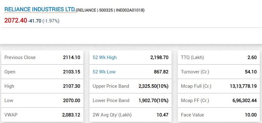 सोमवार को कारोबार के पहले दिन बीएसई 184 अंक ऊपर और निफ्टी 70 पॉइंट की बढ़त के साथ खुला। इससे पहले शुक्रवार को बीएसई 122.45 अंक ऊपर और निफ्टी 52.85 पॉइंट के उछाल के साथ खुला था। कारोबार के शुरुआत में रिलायंस लिमिटेड के शेयर में गिरावट देखी जा रही है। शेयर 2 फीसदी नीचे है।